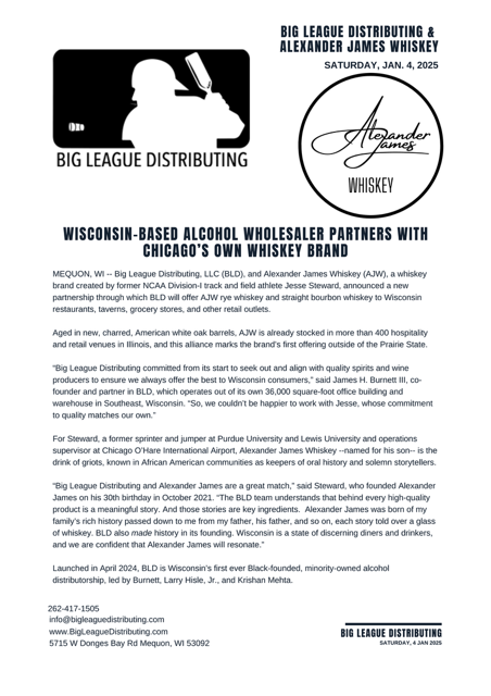 MEQUON, WI -- Big League Distributing, LLC (BLD), and Alexander James Whiskey (AJW), a whiskey brand created by former NCAA Division-I track and field athlete Jesse Steward, announced a new partnership through which BLD will offer AJW rye whiskey and straight bourbon whiskey to Wisconsin restaurants, taverns, grocery stores, and other retail outlets.